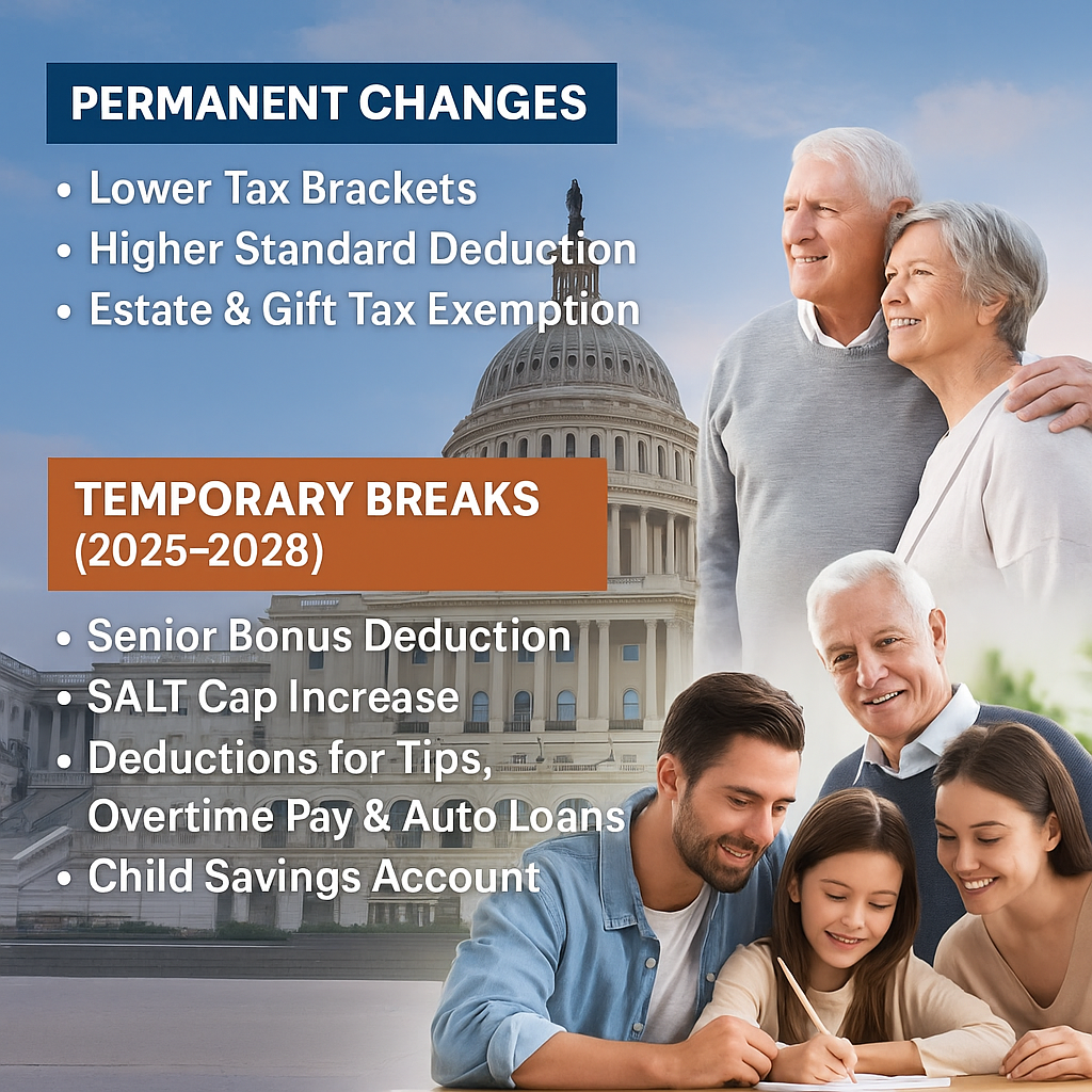 That uncertainty ended in July 2025, when a sweeping new law—nicknamed the One Big Beautiful Bill Act—was signed. This 887-page bill makes many TCJA provisions permanent, adds new tax benefits, and creates a handful of temporary breaks for individuals, families, and small businesses.